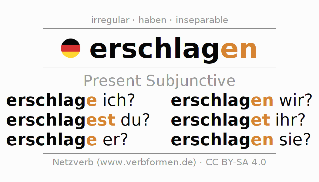 The verb erschlagen fully conjugated in all persons and numbers in the Subjunctive Present