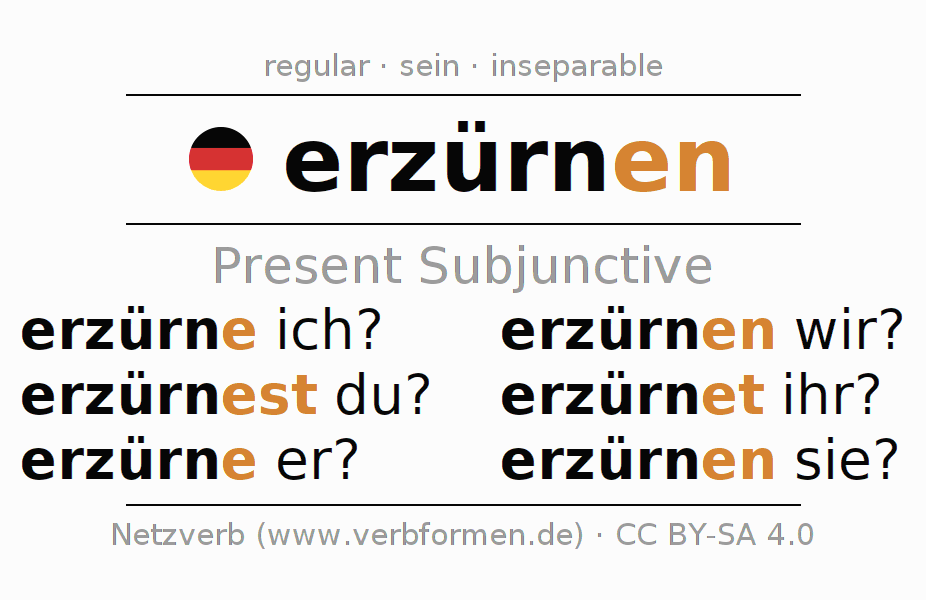 The conjugation of erzürnen in Subjunctive Present Form of possibility Active is erzürne ich?, erzürnest du?, erzürne er?, erzürnen wir?, erzürnet ihr?, erzürnen sie?.The conjugation corresponds to certain grammatical rules. Likewise the requirements for the conjugation of the simple verb forms of erzürnen in Present Subjunctive. Comments ☆
