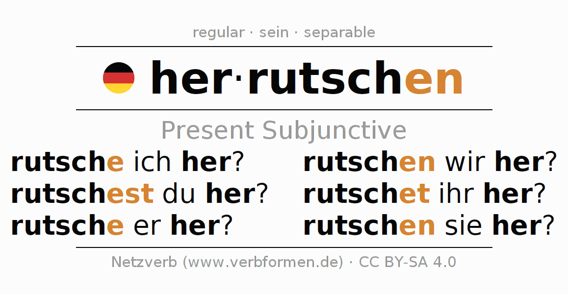 The verb herrutschen fully conjugated in all persons and numbers in the Subjunctive Present