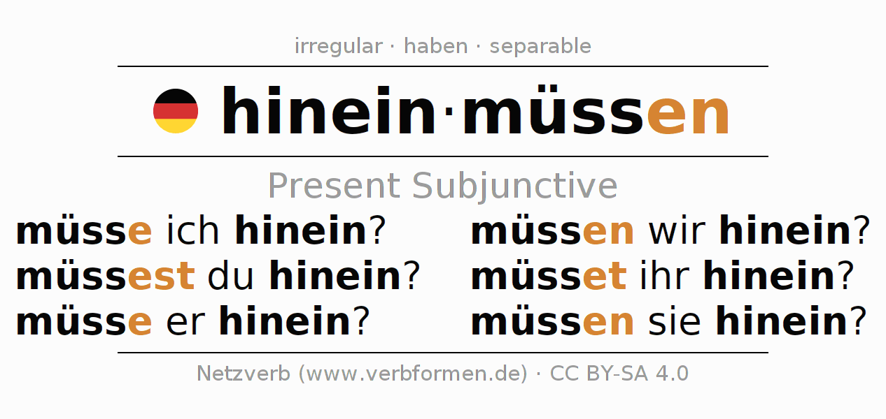 The conjugation of hineinmüssen in Subjunctive Present Form of possibility Active is müsse ich hinein?, müssest du hinein?, müsse er hinein?, müssen wir hinein?, müsset ihr hinein?, müssen sie hinein?.The conjugation corresponds to certain grammatical rules. Likewise the requirements for the conjugation of the simple verb forms of hineinmüssen in Present Subjunctive. Comments ☆