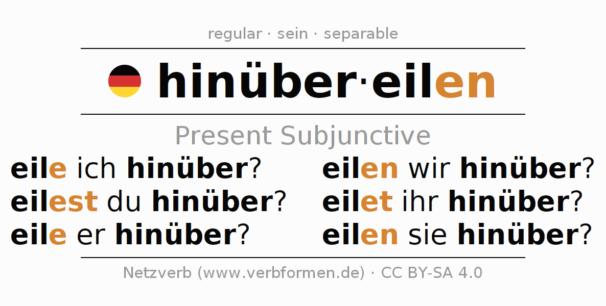 The verb hinübereilen fully conjugated in all persons and numbers in the Subjunctive Present