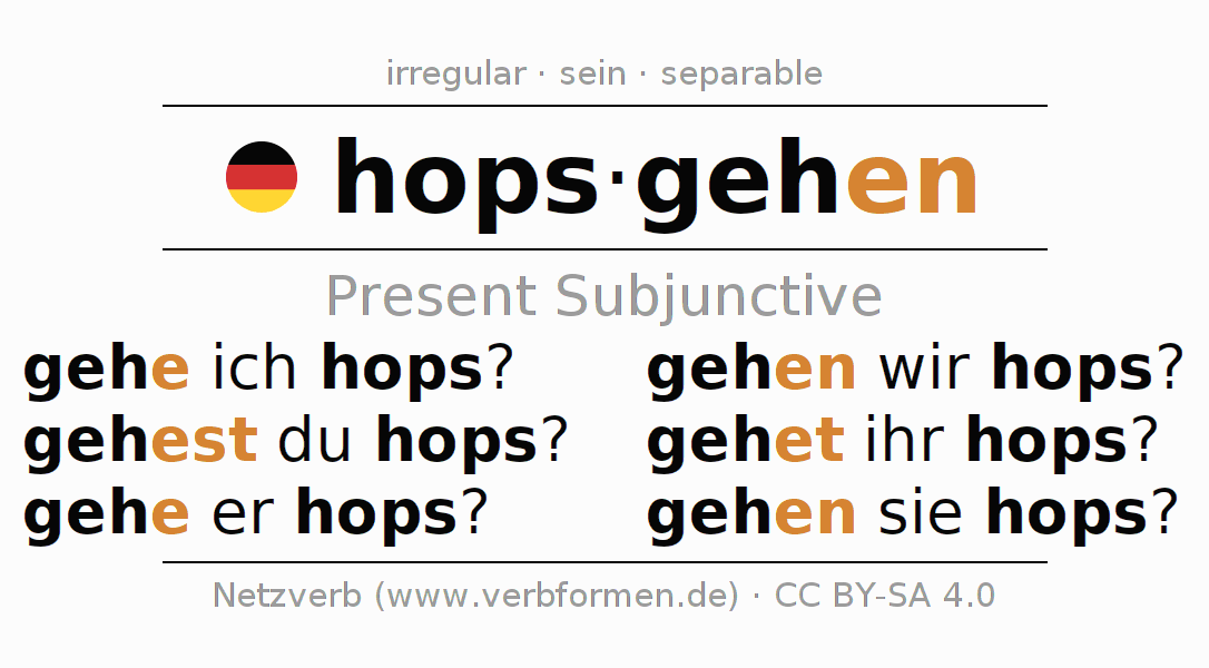The conjugation of hopsgehen in Subjunctive Present Form of possibility Active is gehe ich hops?, gehest du hops?, gehe er hops?, gehen wir hops?, gehet ihr hops?, gehen sie hops?.The conjugation corresponds to certain grammatical rules. Likewise the requirements for the conjugation of the simple verb forms of hopsgehen in Present Subjunctive. Comments ☆