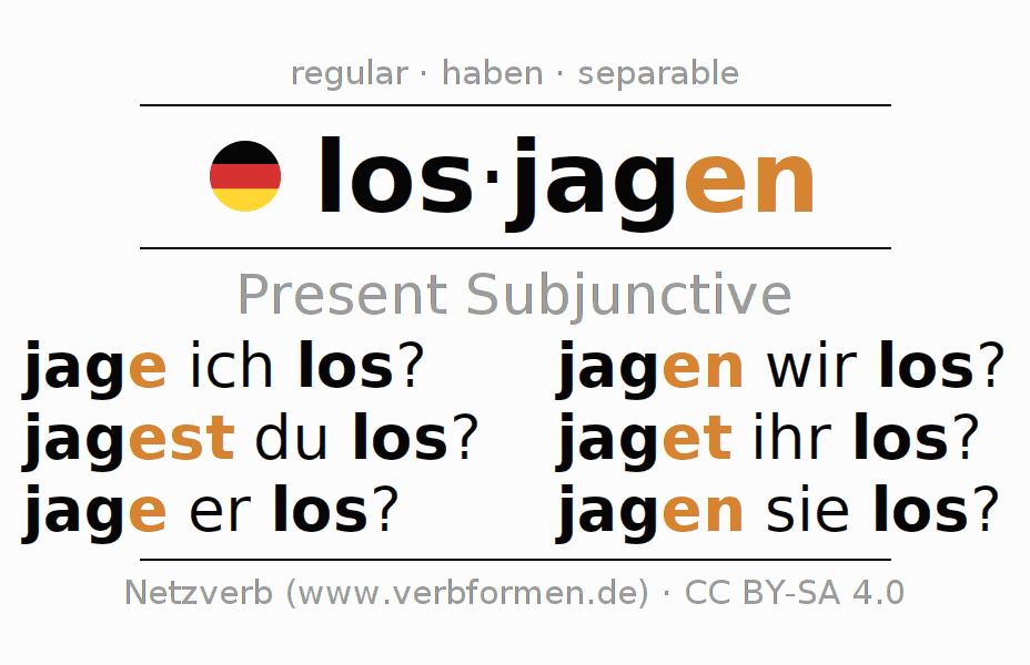 The conjugation of losjagen in Subjunctive Present Form of possibility Active is jage ich los?, jagest du los?, jage er los?, jagen wir los?, jaget ihr los?, jagen sie los?.The conjugation corresponds to certain grammatical rules. Likewise the requirements for the conjugation of the simple verb forms of losjagen in Present Subjunctive. Comments ☆