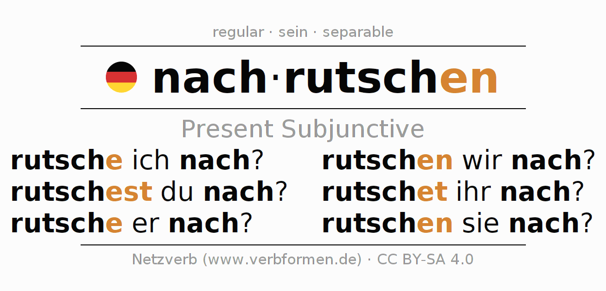 The verb nachrutschen fully conjugated in all persons and numbers in the Subjunctive Present