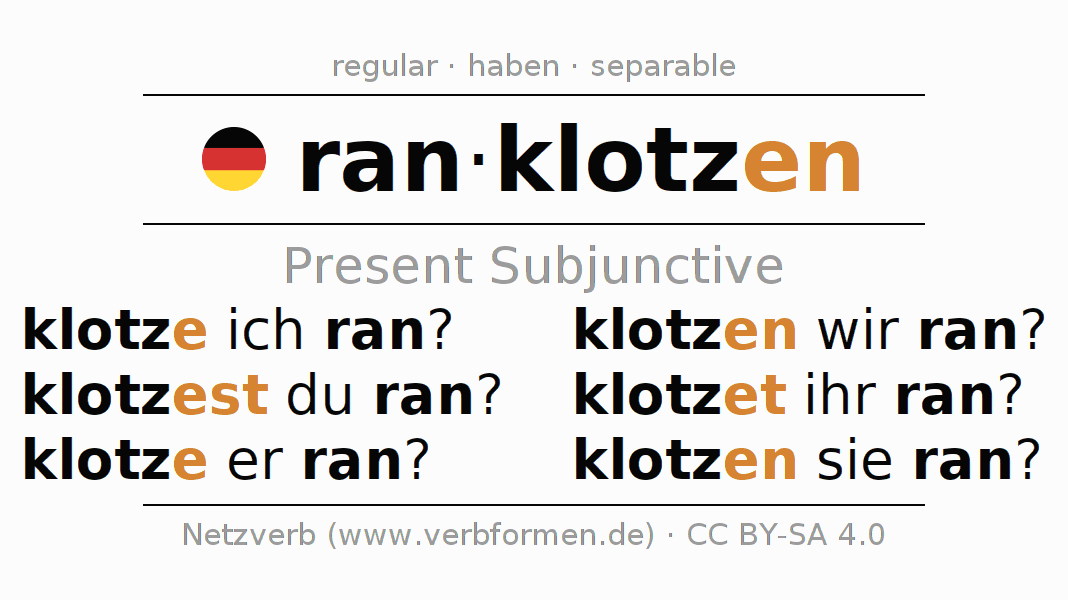 The conjugation of ranklotzen in Subjunctive Present Form of possibility Active is klotze ich ran?, klotzest du ran?, klotze er ran?, klotzen wir ran?, klotzet ihr ran?, klotzen sie ran?.The conjugation corresponds to certain grammatical rules. Likewise the requirements for the conjugation of the simple verb forms of ranklotzen in Present Subjunctive. Comments ☆