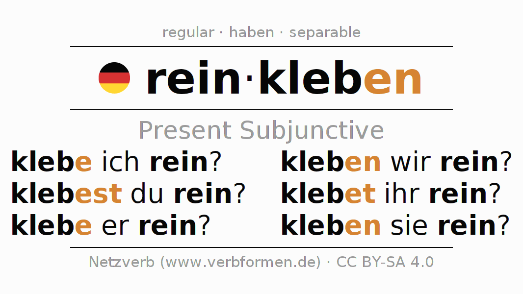 The verb reinkleben fully conjugated in all persons and numbers in the Subjunctive Present