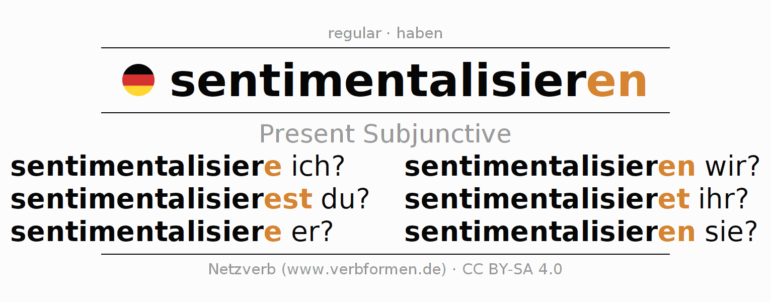 The verb sentimentalisieren fully conjugated in all persons and numbers in the Subjunctive Present