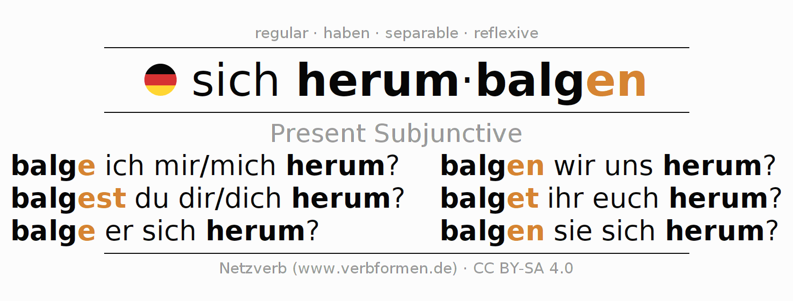 The verb sich herumbalgen fully conjugated in all persons and numbers in the Subjunctive Present