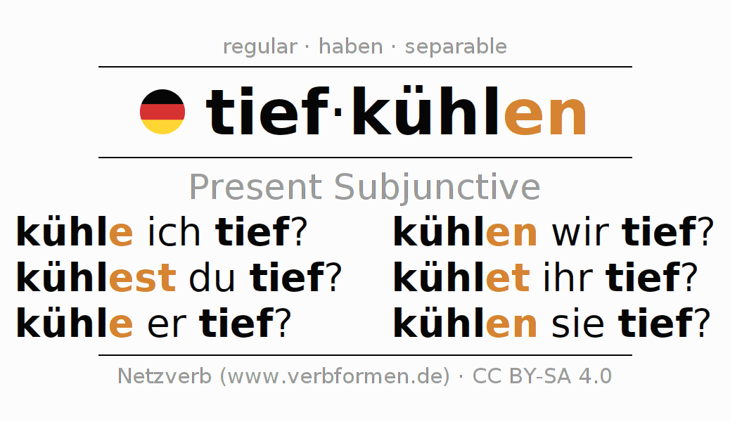 The verb tiefkühlen fully conjugated in all persons and numbers in the Subjunctive Present