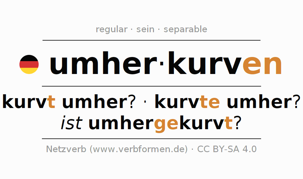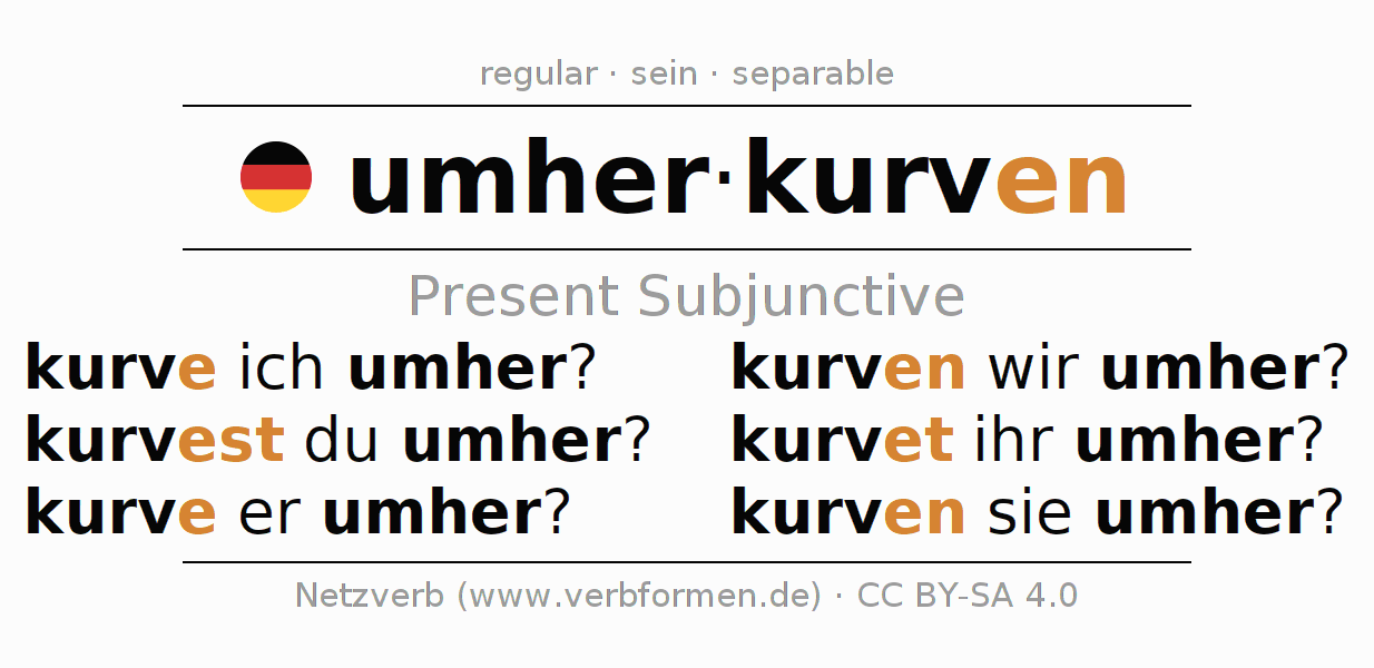 The conjugation of umherkurven in Subjunctive Present Form of possibility Active is kurve ich umher?, kurvest du umher?, kurve er umher?, kurven wir umher?, kurvet ihr umher?, kurven sie umher?.The conjugation corresponds to certain grammatical rules. Likewise the requirements for the conjugation of the simple verb forms of umherkurven in Present Subjunctive. Comments ☆