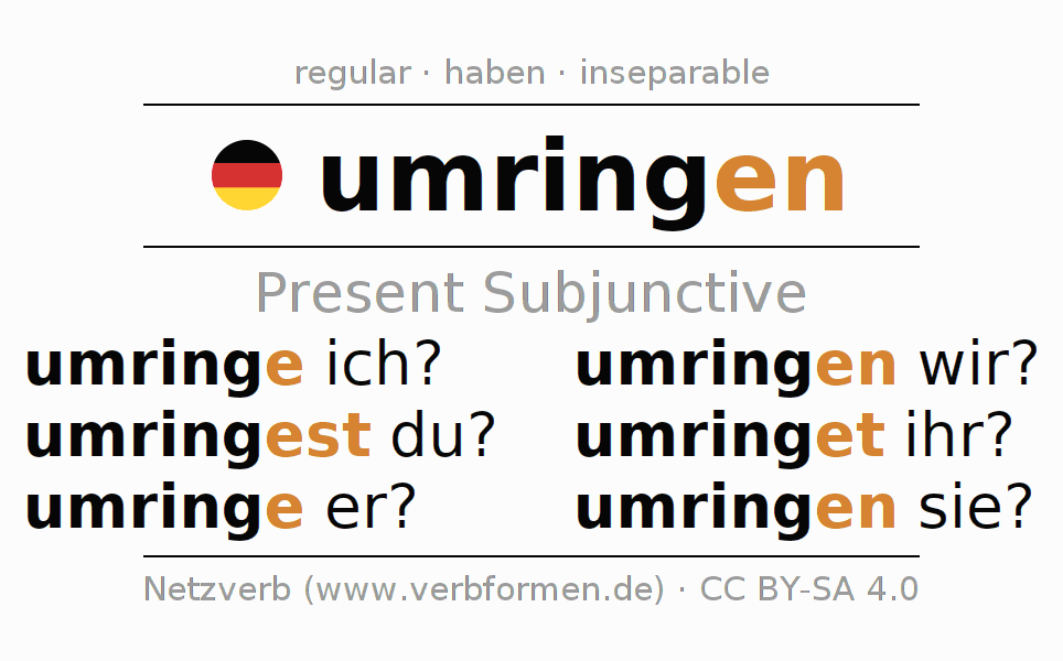 The verb umringen fully conjugated in all persons and numbers in the Subjunctive Present