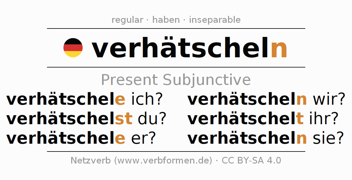 The conjugation of verhätscheln in Subjunctive Present Form of possibility Active is verhätsch(e)le ich?, verhätschelst du?, verhätsch(e)le er?, verhätscheln wir?, verhätschelt ihr?, verhätscheln sie?.The conjugation corresponds to certain grammatical rules. Likewise the requirements for the conjugation of the simple verb forms of verhätscheln in Present Subjunctive. Comments ☆