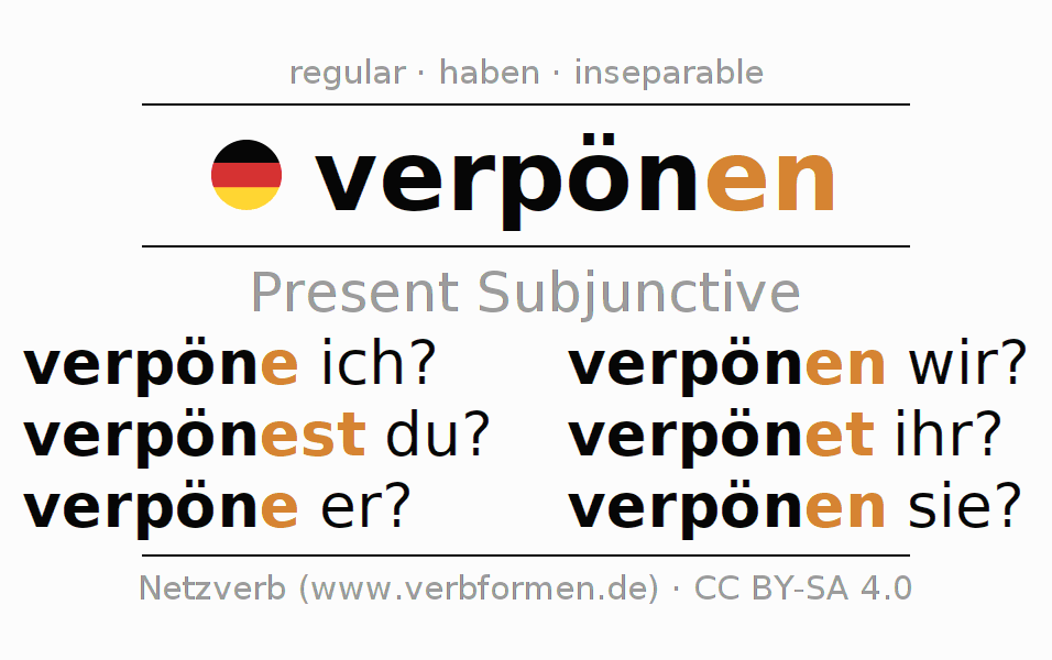 The verb verpönen fully conjugated in all persons and numbers in the Subjunctive Present
