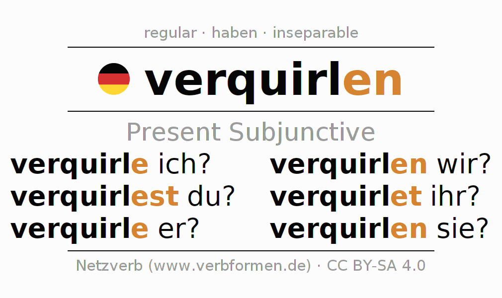 The verb verquirlen fully conjugated in all persons and numbers in the Subjunctive Present