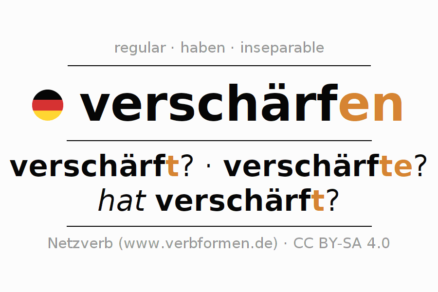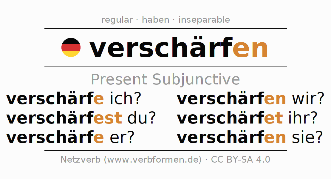 The conjugation of verschärfen in Subjunctive Present Form of possibility Active is verschärfe ich?, verschärfest du?, verschärfe er?, verschärfen wir?, verschärfet ihr?, verschärfen sie?.The conjugation corresponds to certain grammatical rules. Likewise the requirements for the conjugation of the simple verb forms of verschärfen in Present Subjunctive. Comments ☆