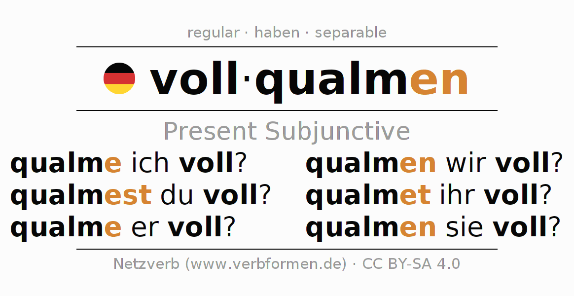 The conjugation of vollqualmen in Subjunctive Present Form of possibility Active is qualme ich voll?, qualmest du voll?, qualme er voll?, qualmen wir voll?, qualmet ihr voll?, qualmen sie voll?.The conjugation corresponds to certain grammatical rules. Likewise the requirements for the conjugation of the simple verb forms of vollqualmen in Present Subjunctive. Comments ☆