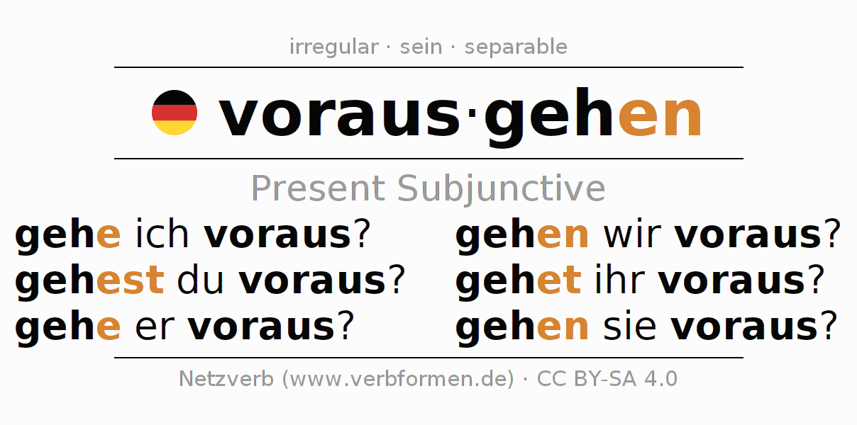 The conjugation of vorausgehen in Subjunctive Present Form of possibility Active is gehe ich voraus?, gehest du voraus?, gehe er voraus?, gehen wir voraus?, gehet ihr voraus?, gehen sie voraus?.The conjugation corresponds to certain grammatical rules. Likewise the requirements for the conjugation of the simple verb forms of vorausgehen in Present Subjunctive. Comments ☆