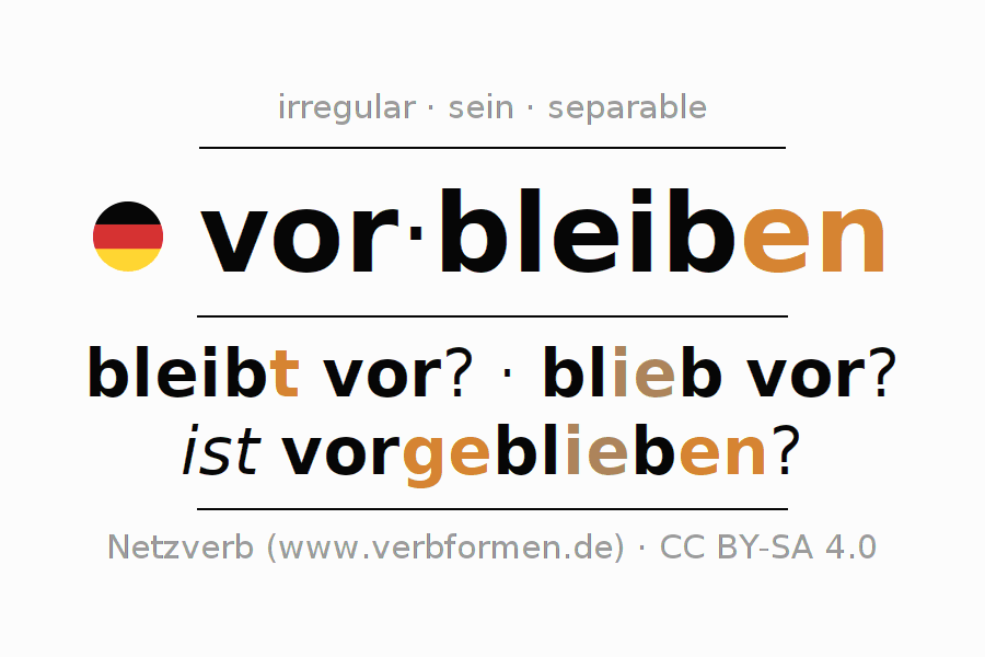 The conjugation of vorbleiben in Subjunctive Present Form of possibility Active is bleibe ich vor?, bleibest du vor?, bleibe er vor?, bleiben wir vor?, bleibet ihr vor?, bleiben sie vor?.The conjugation corresponds to certain grammatical rules. Likewise the requirements for the conjugation of the simple verb forms of vorbleiben in Present Subjunctive. Comments ☆