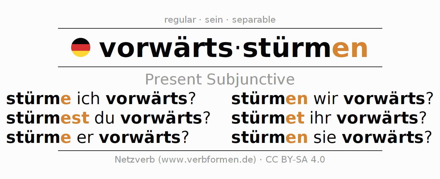 The verb vorwärtsstürmen fully conjugated in all persons and numbers in the Subjunctive Present