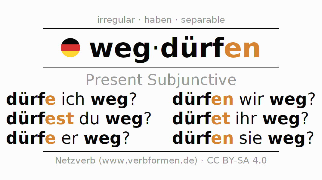 The conjugation of wegdürfen in Subjunctive Present Form of possibility Active is dürfe ich weg?, dürfest du weg?, dürfe er weg?, dürfen wir weg?, dürfet ihr weg?, dürfen sie weg?.The conjugation corresponds to certain grammatical rules. Likewise the requirements for the conjugation of the simple verb forms of wegdürfen in Present Subjunctive. Comments ☆