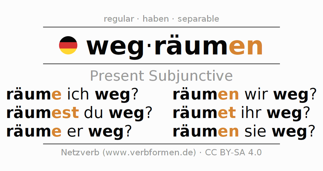 The verb wegräumen fully conjugated in all persons and numbers in the Subjunctive Present