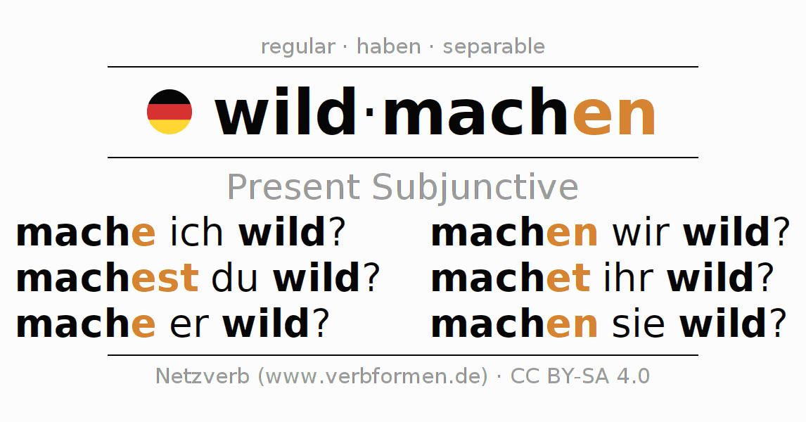 The conjugation of wildmachen in Subjunctive Present Form of possibility Active is mache ich wild?, machest du wild?, mache er wild?, machen wir wild?, machet ihr wild?, machen sie wild?.The conjugation corresponds to certain grammatical rules. Likewise the requirements for the conjugation of the simple verb forms of wildmachen in Present Subjunctive. Comments ☆