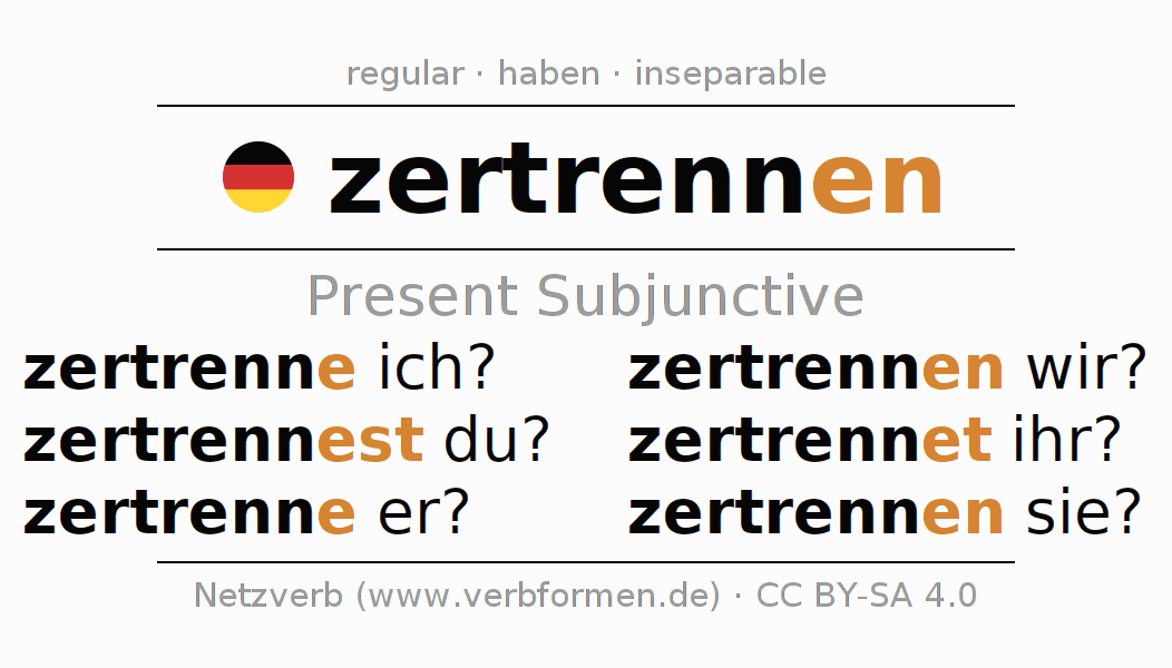 The verb zertrennen fully conjugated in all persons and numbers in the Subjunctive Present