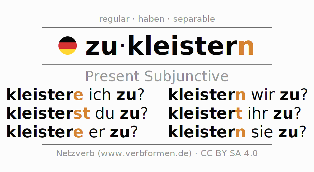 The verb zukleistern fully conjugated in all persons and numbers in the Subjunctive Present