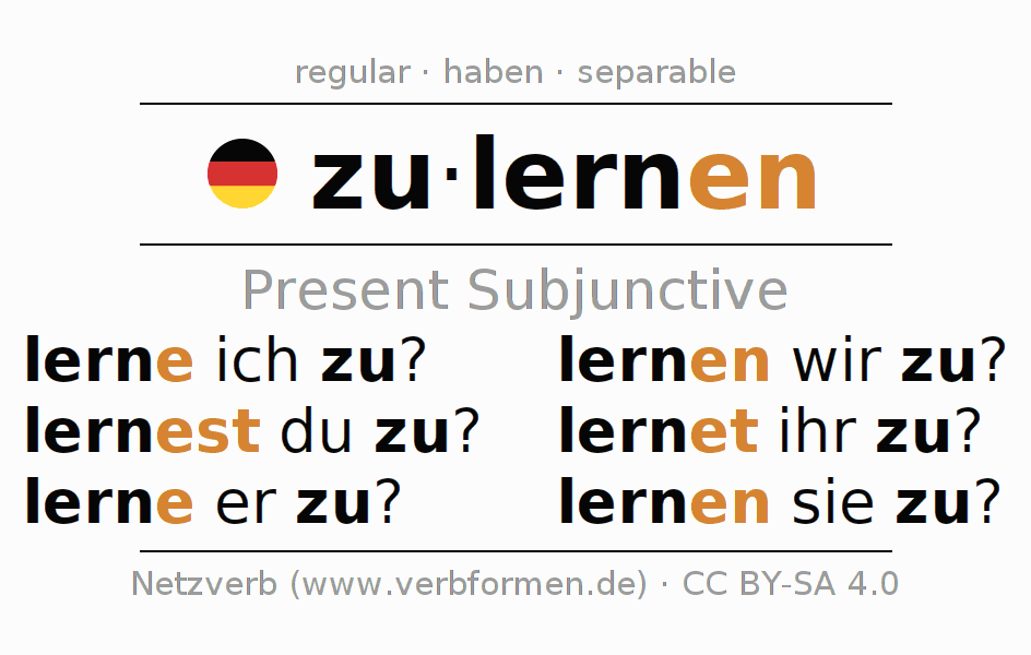 The conjugation of zulernen in Subjunctive Present Form of possibility Active is lerne ich zu?, lernest du zu?, lerne er zu?, lernen wir zu?, lernet ihr zu?, lernen sie zu?.The conjugation corresponds to certain grammatical rules. Likewise the requirements for the conjugation of the simple verb forms of zulernen in Present Subjunctive. Comments ☆