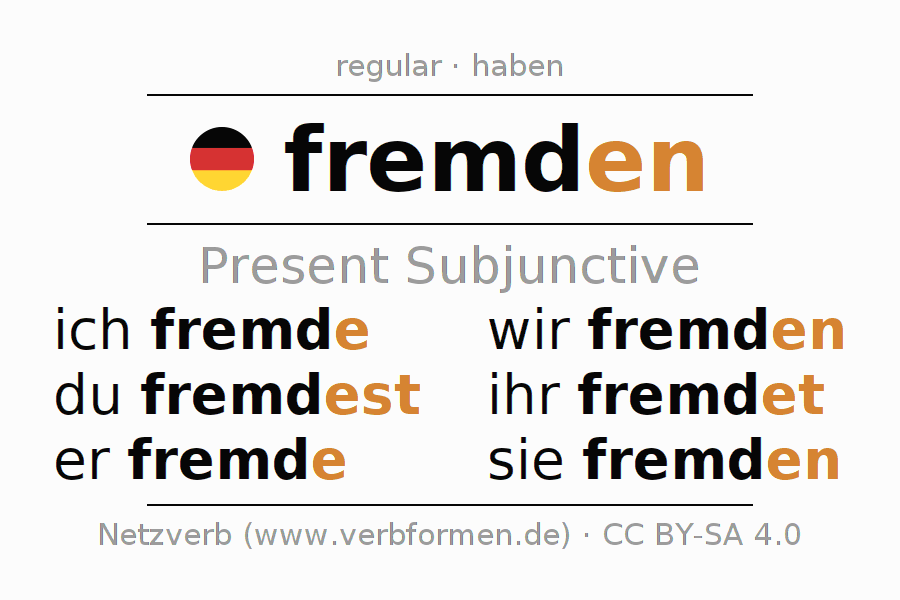 The verb fremden fully conjugated in all persons and numbers in the Subjunctive Present