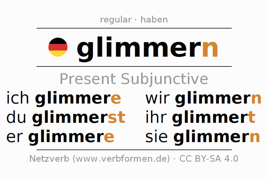 The verb glimmern fully conjugated in all persons and numbers in the Subjunctive Present