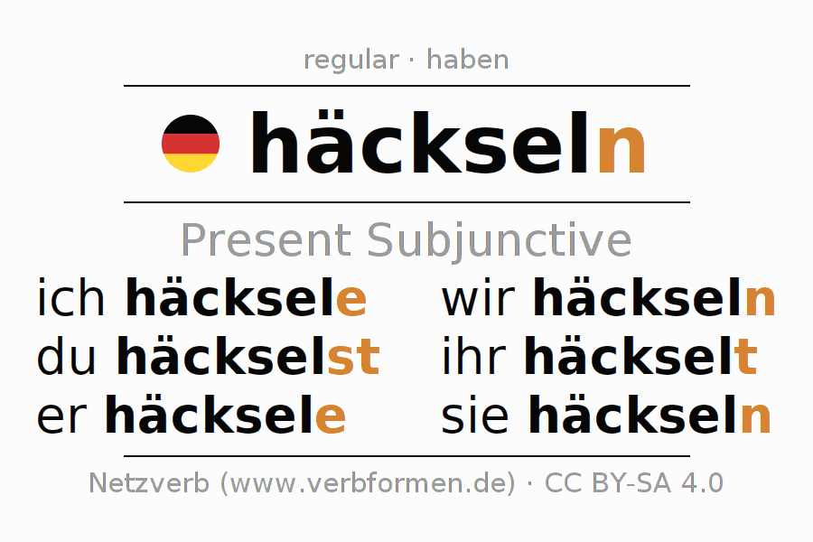 The verb häckseln fully conjugated in all persons and numbers in the Subjunctive Present