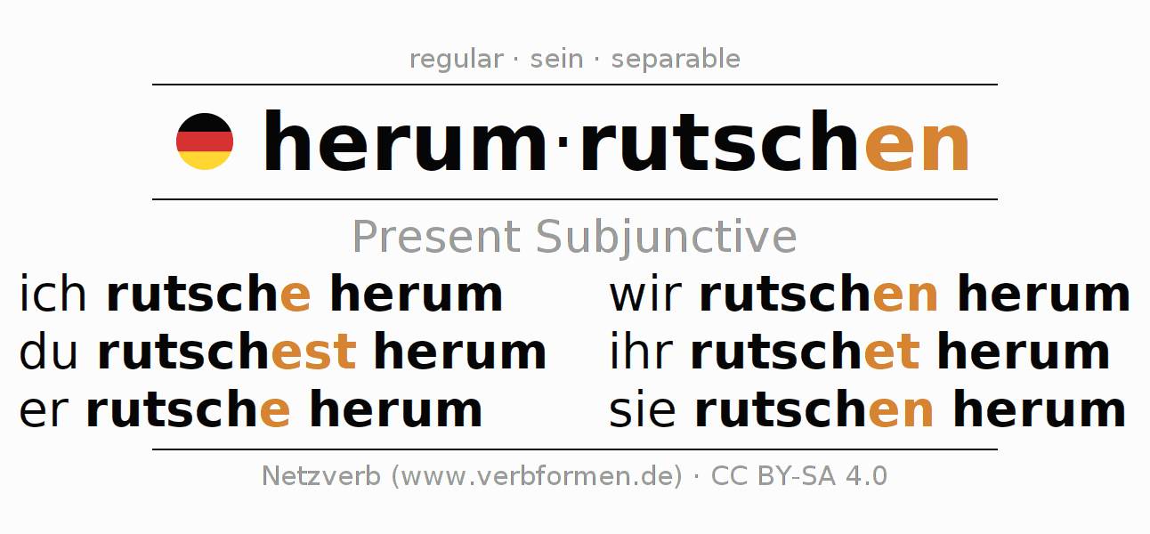 The verb herumrutschen fully conjugated in all persons and numbers in the Subjunctive Present