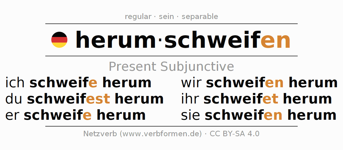 The verb herumschweifen fully conjugated in all persons and numbers in the Subjunctive Present