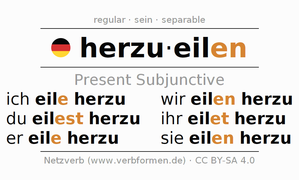 The conjugation of herzueilen (rush, hurry) in subjunctive I is: ich eile herzu, du eilest herzu, er eile herzu, wir eilen herzu, ihr eilet herzu, sie eilen herzu. The endings -e, -est, -e, -en, -et, -en are appended to the base or verb stem eil. The prefix herzu- of herzueilen is separated. The conjugation of these forms conforms to the grammatical rules for verbs in the subjunctive I tense.