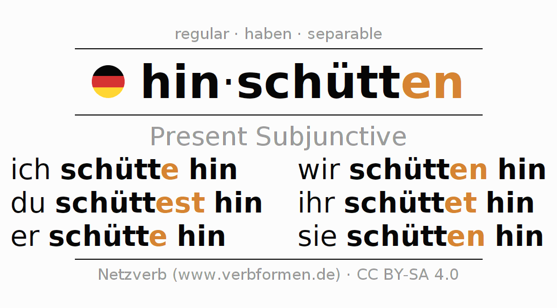 The conjugation of hinschütten (dump, pour) in subjunctive I is: ich schütte hin, du schüttest hin, er schütte hin, wir schütten hin, ihr schüttet hin, sie schütten hin. The endings -e, -est, -e, -en, -et, -en are appended to the base or verb stem schütt. The prefix hin- of hinschütten is separated. The conjugation of these forms conforms to the grammatical rules for verbs in the subjunctive I tense.