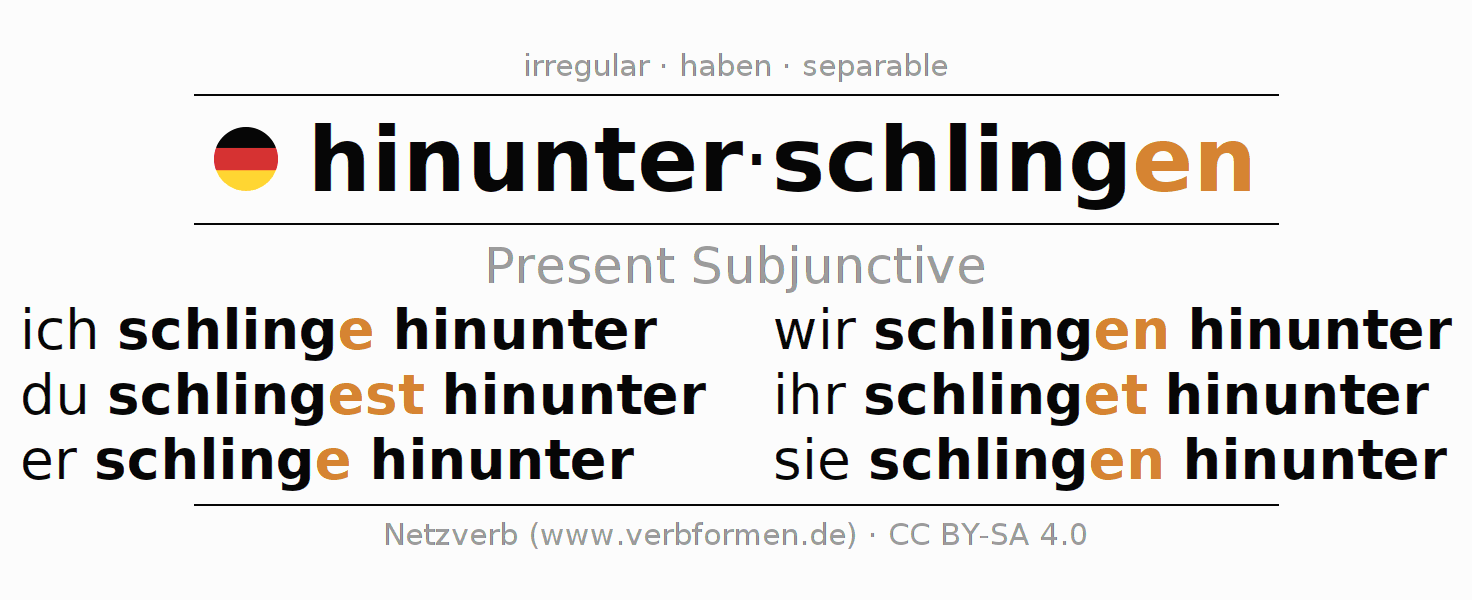 The verb hinunterschlingen fully conjugated in all persons and numbers in the Subjunctive Present