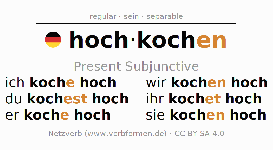 The verb hochkochen fully conjugated in all persons and numbers in the Subjunctive Present