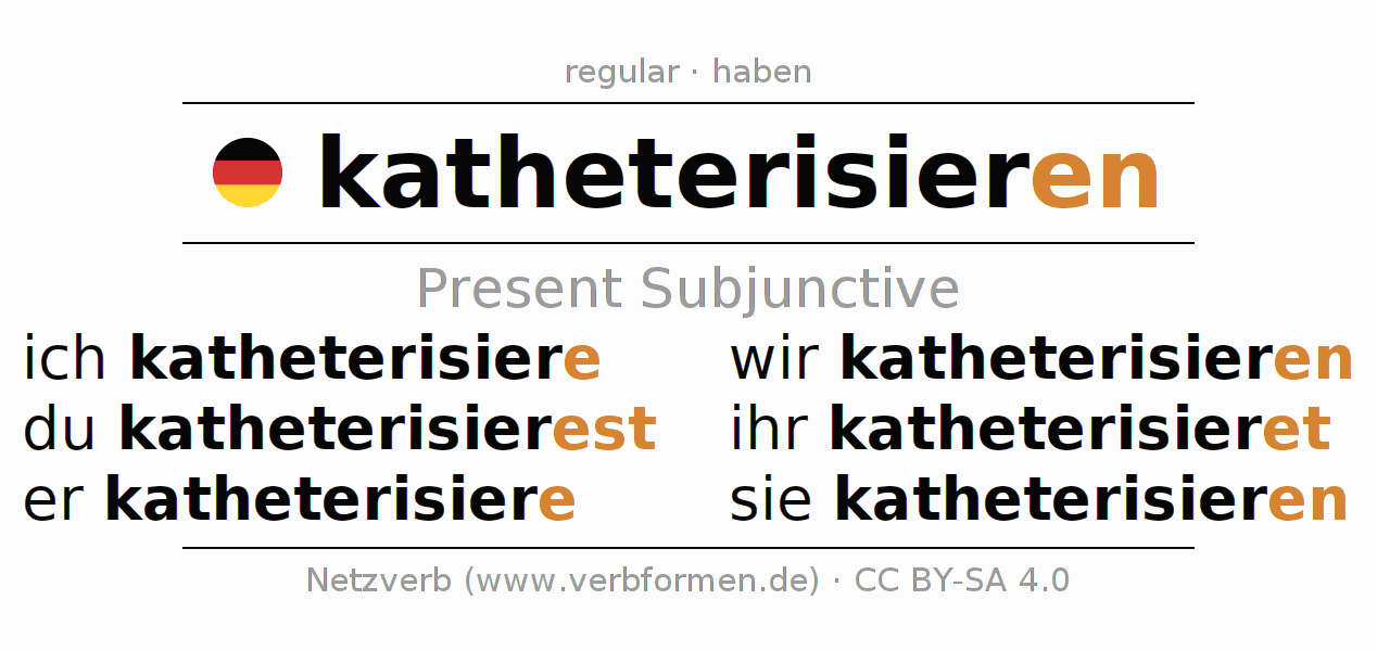 The verb katheterisieren fully conjugated in all persons and numbers in the Subjunctive Present