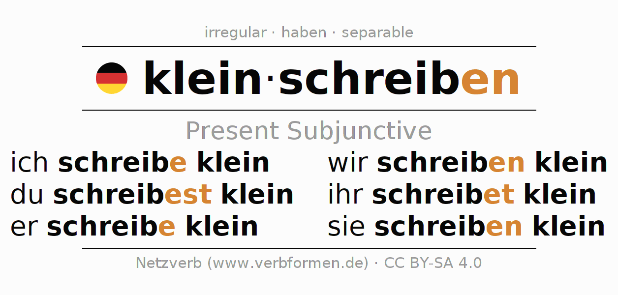 The verb kleinschreiben fully conjugated in all persons and numbers in the Subjunctive Present