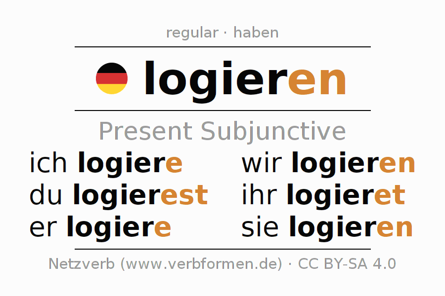The verb logieren fully conjugated in all persons and numbers in the Subjunctive Present