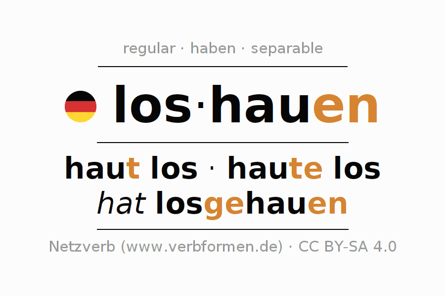 The conjugation of loshauen (attack, hit) in subjunctive I is: ich haue los, du hauest los, er haue los, wir hauen los, ihr hauet los, sie hauen los. The endings -e, -est, -e, -en, -et, -en are appended to the base or verb stem hau. The prefix los- of loshauen is separated. The conjugation of these forms conforms to the grammatical rules for verbs in the subjunctive I tense.