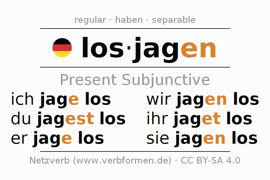 The conjugation of losjagen (chase, start quickly) in subjunctive I is: ich jage los, du jagest los, er jage los, wir jagen los, ihr jaget los, sie jagen los. The endings -e, -est, -e, -en, -et, -en are appended to the base or verb stem jag. The prefix los- of losjagen is separated. The conjugation of these forms conforms to the grammatical rules for verbs in the subjunctive I tense.