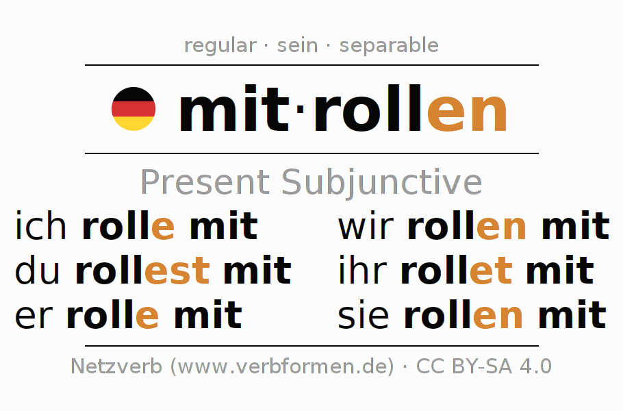 The verb mitrollen fully conjugated in all persons and numbers in the Subjunctive Present