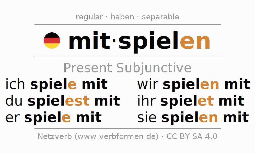 The verb mitspielen fully conjugated in all persons and numbers in the Subjunctive Present