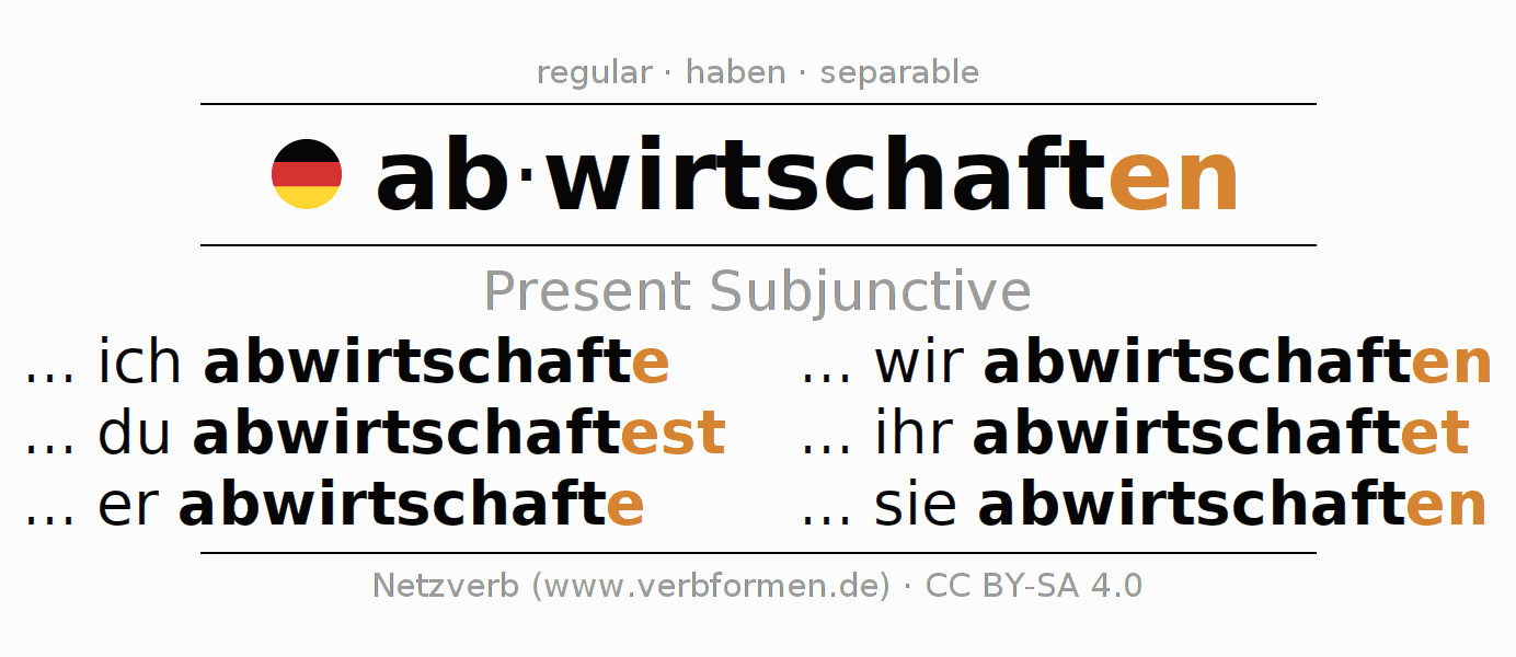 The verb abwirtschaften fully conjugated in all persons and numbers in the Subjunctive Present