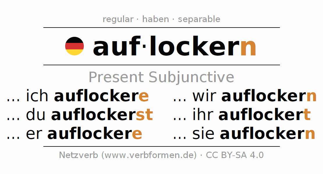 The verb auflockern fully conjugated in all persons and numbers in the Subjunctive Present