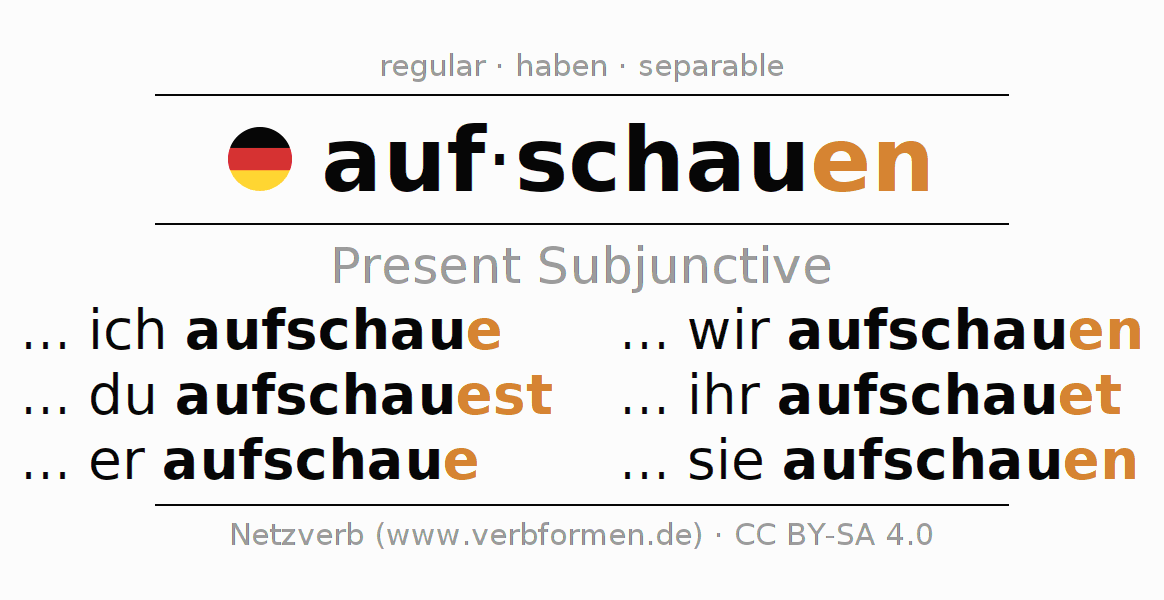 The verb aufschauen fully conjugated in all persons and numbers in the Subjunctive Present