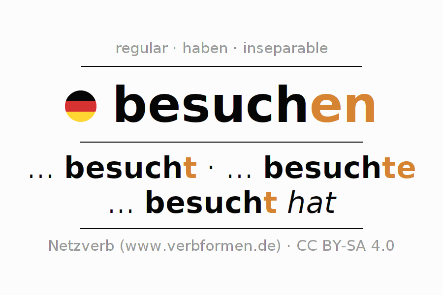 The conjugation of besuchen in Subjunctive Present Form of possibility Active is ... ich besuche, ... du besuchest, ... er besuche, ... wir besuchen, ... ihr besuchet, ... sie besuchen.The conjugation corresponds to certain grammatical rules. Likewise the requirements for the conjugation of the simple verb forms of besuchen in Present Subjunctive. Comments ☆
