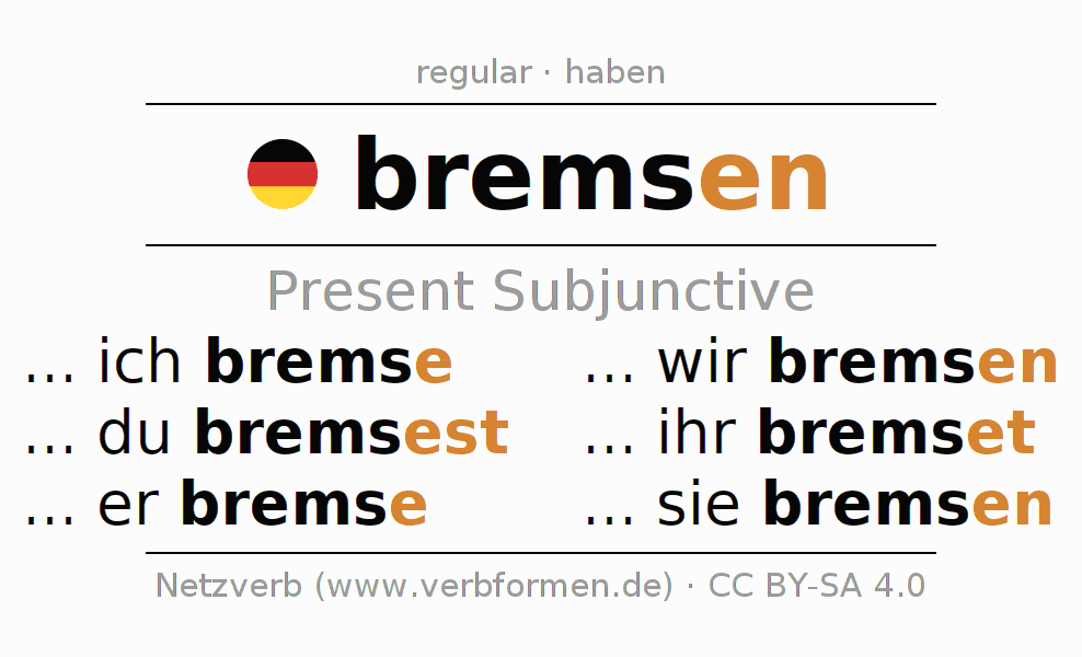 The verb bremsen fully conjugated in all persons and numbers in the Subjunctive Present